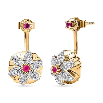 African Ruby & Natural Zircon Dangle Floral Earrings in 18K Vermeil YG Plated Sterling Silver 1.23 Ct, Silver Wt. 9.46 Gms