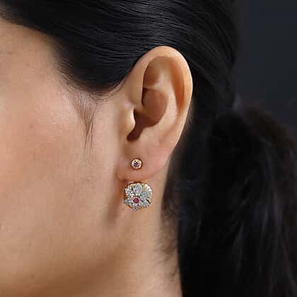 Fissure Filled Ruby, White Zircon Fancy Earring in 18K Vermeil Yellow Gold Sterling Silver 1.68 ct, Silver Wt. 6 Gms 1.232 Ct.