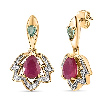 African Ruby, Natural Zircon & Zambian Emerald Earrings in 18K Yellow Gold Vermeil Plated Sterling Silver 3.74 Ct.