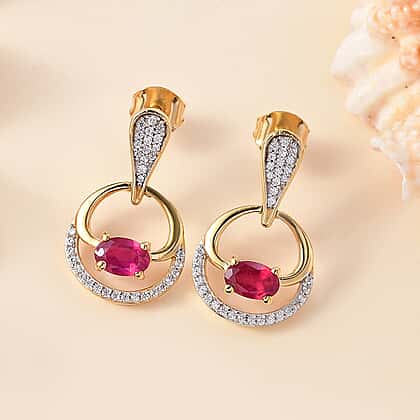 African Ruby & White Zircon Dangling Earring with Push Back in 18K Vermeil Yellow Gold Plated Sterling Silver 2.63 Ct.