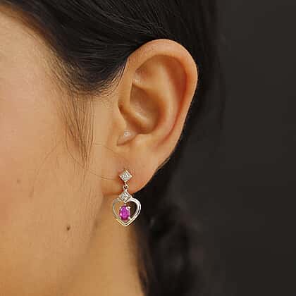 African Ruby & White Zircon Solitaire Stud Push Back Earrings in Rhodium Overlay Sterling Silver 1.48 Ct.