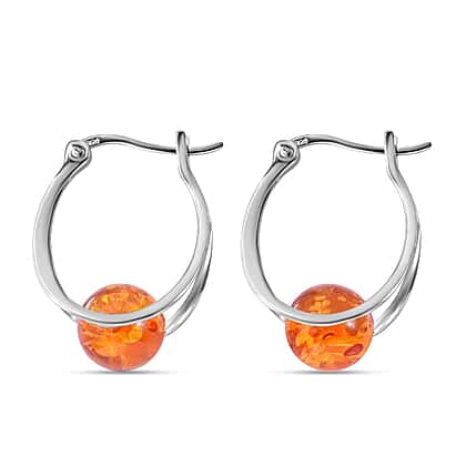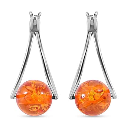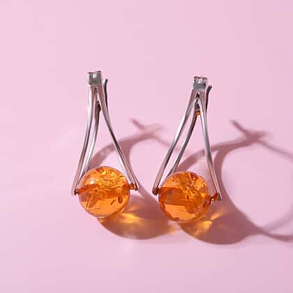 Style up your party dress with these Baltic amber earrings fashioned out of sterling silver. Round-shaped Amber gemstones have been secured in a unique setting to give a grand display of their fiery orange tone. The hinged-hoop clasps give these earrings a free-flowing dangling effect. Fine silver clothed in the polished shine of rhodium overlay adds to the eye-catching look of the earpieces.