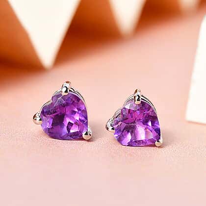 Amethyst Heart Stud Earrings with Push Back in Platinum Overlay Sterling Silver 1.40 Ct.