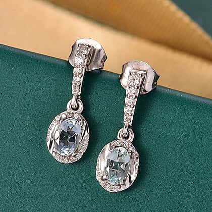 Aquamarine & White Zircon Earring with Push Back in Rhodium Overlay Sterling Silver 1.04 Ct.