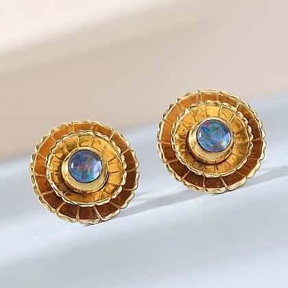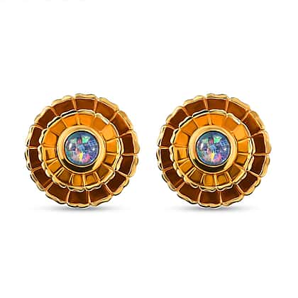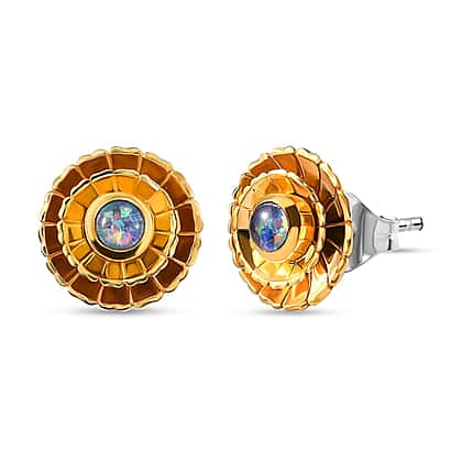 Australian Boulder Opal Triplet Floral Stud Earrings (With Push Back) in Platinum and Yellow Gold Overlay Sterling Silver