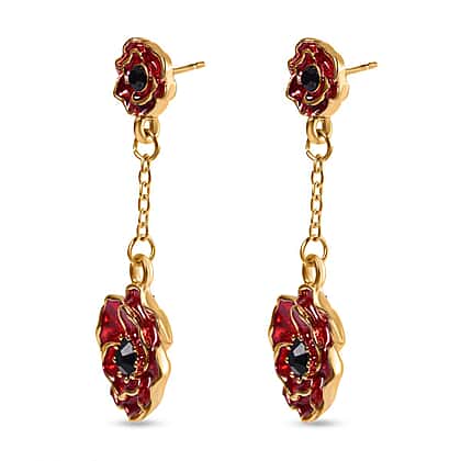 Harnessing nature into colourful and sculptural forms, these red poppy-flowers inspired Austrian black crystal dangling earrings will surely add a romantic touch to your look. Crafted in pure alloy, polished with yellow-gold plated colour, these earring features a layered red enamel flower accented with a bold black crystal at the centre. The floral motif is attached to a dainty chain drop, featuring a blooming red flower at the end. If you are someone looking for pieces that work in harmony with natural surroundings, then these floral earrings make for the perfect pick.
