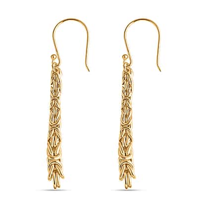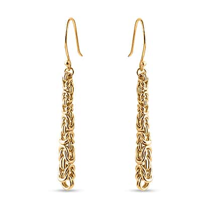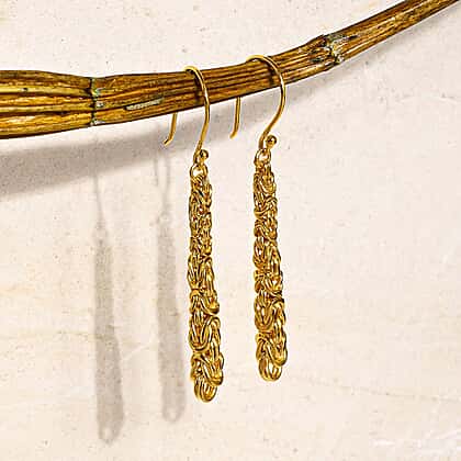 These earrings offer a unique woven design that captures attention with their textured finish. The elongated shape provides a modern and sophisticated look, perfect for adding a touch of luxury to any outfit. Made in 22K vermeil yellow gold plating on 925 sterling silver, these earrings offer enduring shine and a warm tone finish. Crafted for durability, these earrings combine style with comfort, featuring a secure hook fastening that ensures a perfect fit. Whether you're dressing up for a special occasion or adding some flair to your everyday look, these earrings are a standout piece.