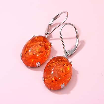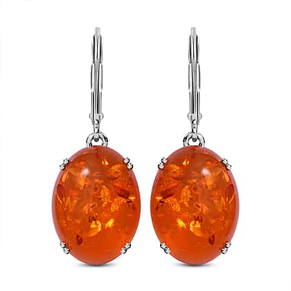 Style up your party dress with these Baltic amber lever-back earrings fashioned out of sterling silver. Oval-shaped ambers have been mounted on prongs to give a grand display to their bright orange tone. Lever-back clasps give these earrings a free-flowing dangling effect. Fine silver clothed in the polished shine of rhodium overlay adds to the eye-catching look of the earpieces.