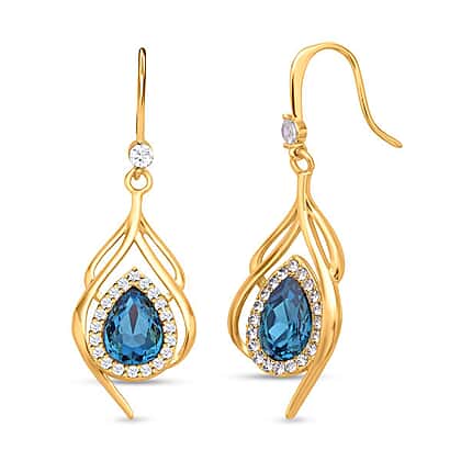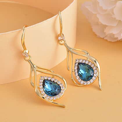 Blue Austrian Crystal and Simulated Diamond Dangle Earrings (with Fish Hook) in Yellow Gold Tone