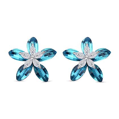 Blue Austrian Crystal and Simulated Diamond Plumeria Floral Earrings in Silver Tone