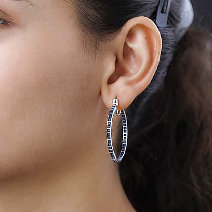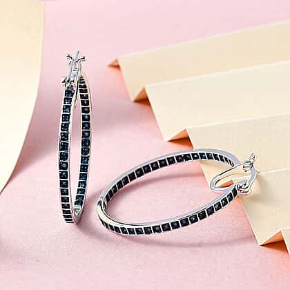 Blue Diamond Hoop Earrings in Platinum Overlay Sterling Silver 1.00 Ct, Silver Wt. 8.53 Gms.