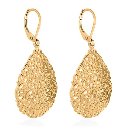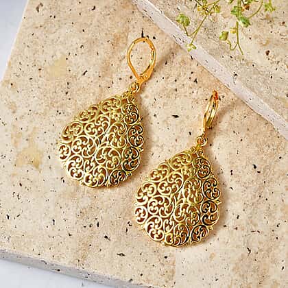Intricately designed to capture attention, these drop earrings feature a detailed filigree pattern that brings depth and artistry to every angle. The openwork design forms a graceful teardrop shape, allowing light to pass through and highlight the fine craftsmanship within. The delicate pattern creates a rich texture while maintaining a lightweight feel, making them comfortable for extended wear. Finished with a secure lever-back hook, they move naturally with you, adding a soft sense of motion to the look. Finished in a warm yellow gold tone, they offer a radiant glow that enhances their ornate detailing. They are a reflection of craftsmanship, detail, and expressive style. Make them yours and bring an artistic touch of detail to your collection.