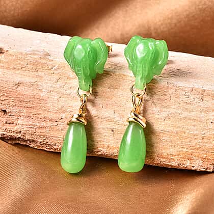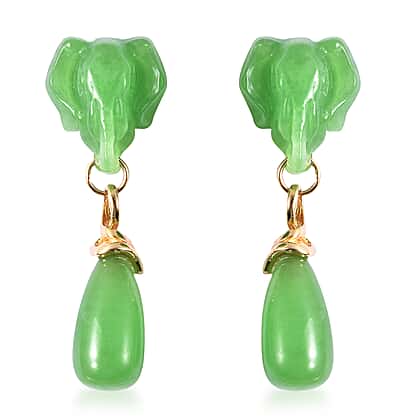 Carved Green Jade Elephant Drop Earrings (with Push Back) in Yellow Gold Overlay Sterling Silver 43.50 Ct.