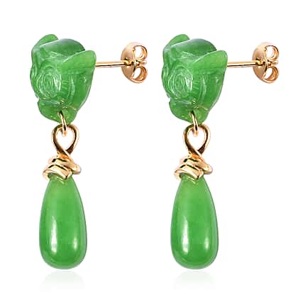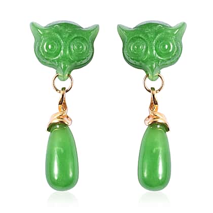 Carved Green Jade Owl Drop Earrings (with Push Back) in Yellow Gold Overlay Sterling Silver 42.25 Ct.