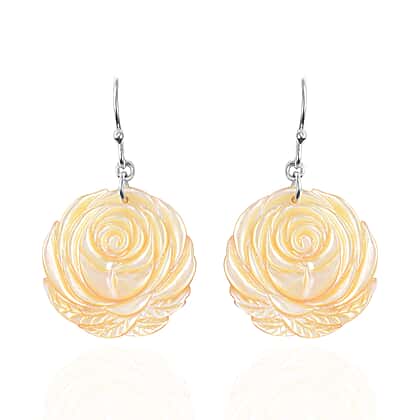 Carved Yellow Mother of Pearl Rose Floral Drop Earrings with Hook in Rhodium Plated Silver