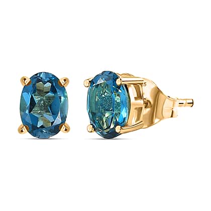 Certified London Blue Topaz Solitaire Stud Push Post Earring in Yellow Gold Plated Sterling Silver 1.92 Ct.