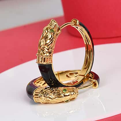 0.20 Ct Chrome Diopside Enamelled Dragon Head Hoop Earrings in Gold Plated Sterling Silver
