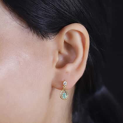 Colombian Emerald, White Zircon Dangling Earring in 18K Yellow Gold Vermeil Plated Sterling Silver