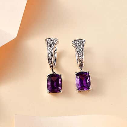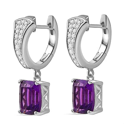 Studded with rare African Amethysts and sparkling White Zircons, the J Hoop Half Hoop Earrings look pretty and petite in Sterling Silver. These half-hoop earrings feature a contemporary J-hoop structure, embellished with faceted white zircon rounds for dazzling brilliance. Anchored by a bold 9x7 mm cushion-cut African amethyst, the rhodium-finished sterling silver adds a natural flamboyance to the design.