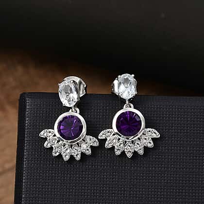African Amethyst, White Topaz Drop Earrings in Rhodium Overlay Sterling Silver