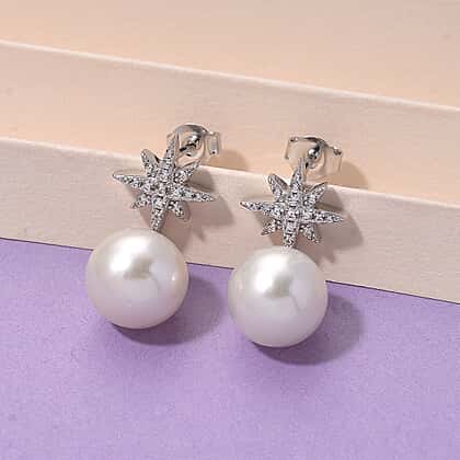 Designer Inspired - D'joy Edison Pearl & White Zircon Earring with Push Back in Rhodium Overlay Sterling Silver 16.23 Ct.