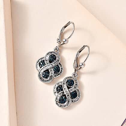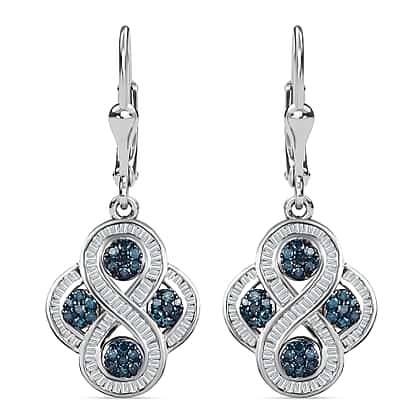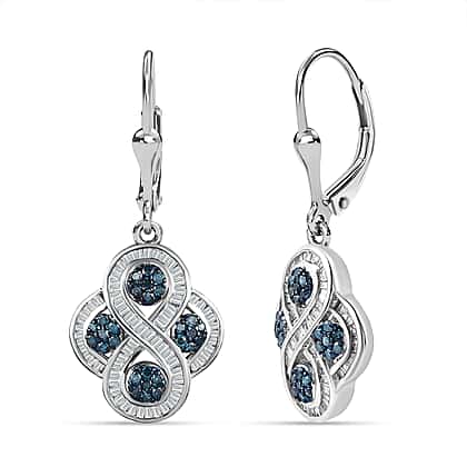 Blue Diamond, White Diamond Lever Back Earrings in Platinum Overlay Sterling Silver