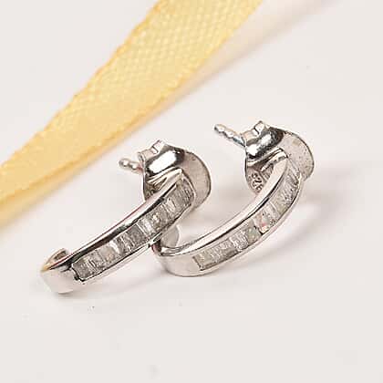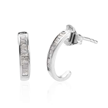 Diamond J Hoop Earrings (with Push Back) in Platinum Overlay Sterling Silver 0.25 Ct.