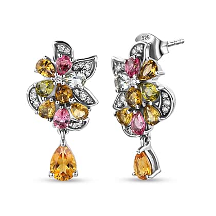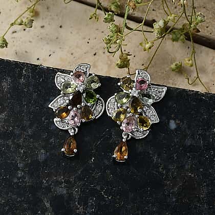 D'Joy - Multi-Tourmaline & White Zircon Cluster Earring with Push Post in Rhodium Overlay Sterling Silver 3.15 Ct.
