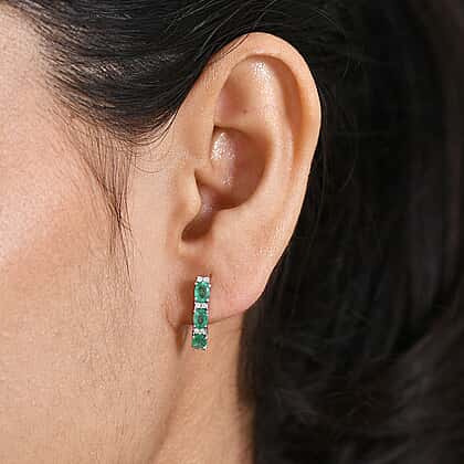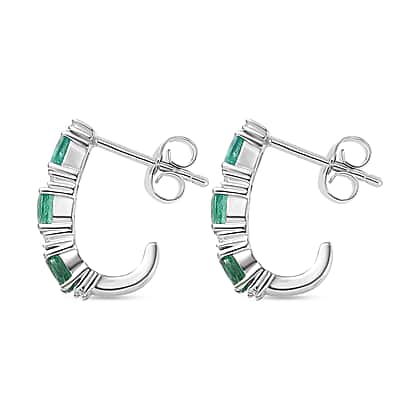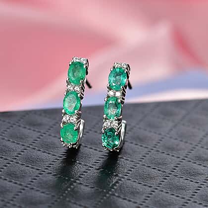 D'Joy AAA Gemfields Zambian Emerald & White Zircon Half Hoop Earring with Push Back in Rhodium Overlay Sterling Silver 1.21 Ct.