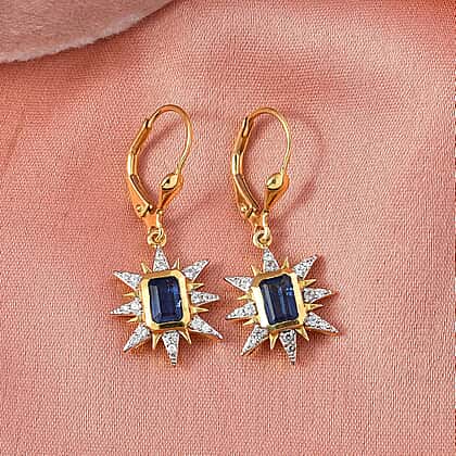 Experience radiant brilliance with these AAA natural kashmir kyanite and white zircon starburst dangling earrings. Designed with a striking rectangular kyanite centre framed by shimmering white zircon rays, this bold sun-inspired silhouette creates dramatic sparkle and depth. Crafted in yellow gold plating on 925 sterling silver, the warm finish enhances the rich royal blue hue while adding luxurious contrast. The articulated drop design offers beautiful movement, making them perfect for special occasions and standout styling. Secured with lever back fastenings, these earrings provide comfort, security and captivating shine.