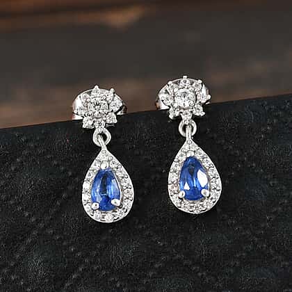 D'Joy AAA Natural Kashmir Kyanite & White Zircon Pear Cut Dangling Earring with Push Back in Rhodium Overlay Sterling Silver 1.06 Ct.