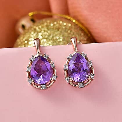 D'Joy AAA Rose De France Amethyst & White Zircon Dangling Earring with Push Post in Rose Gold Plated Sterling Silver 2.39 Ct.