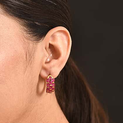Displaying a captivating rows of African ruby gemstones, set across a full hoop design, these earrings create a bold and distinctive jewellery statement. The earrings feature multiple oval-cut rubies arranged closely together, forming a rich pattern that highlights the deep red tones of the stones. Crafted in 18K vermeil yellow gold plating on sterling silver, adds a thick layer of gold and enhances the beauty of the rubies while offering durability and shine. The full hoop structure curves gracefully around the ear, giving the earrings a confident and eye-catching presence suitable for both everyday styling and special occasions.