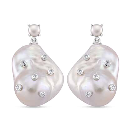 This elegant pair of earrings features organic-shaped white baroque pearls, accented with sparkling lab-grown diamonds and finished with a luminous white freshwater pearl stud. Each piece is set in rhodium overlay sterling silver, providing a cool, contemporary sheen that elevates the timeless appeal of pearls. The push-back closure ensures secure, comfortable wear for all-day sophistication. The unique nature of baroque pearls makes every set one of a kind, perfect for those who appreciate both individuality and ethical luxury. It makes a great choice for modern brides, or anyone seeking a meaningful accessory. These dangling earrings honor the beauty found in natural forms.