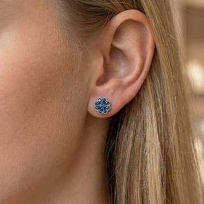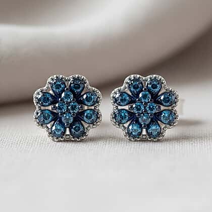 D'Joy Blue Diamond Cluster Push Post Earring in Rhodium Overlay Sterling Silver