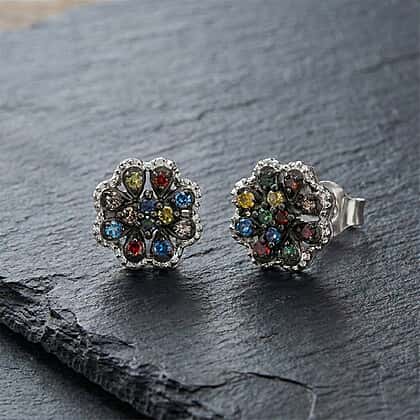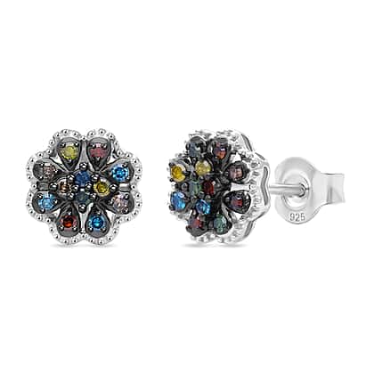 D'Joy Blue Diamond & Multi Gemstones Push Post Earring in Rhodium Overlay Sterling Silver 0.24 Ct