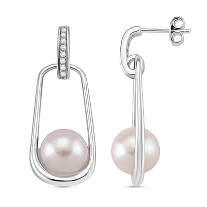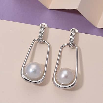 D'joy Edison Pearl & White Zircon Earring with Push Back in Rhodium Overlay Sterling Silver 17.11 Ct.
