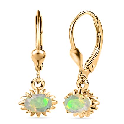 Light up your look with the magical glow of these Ethiopian opal drop earrings today. Showcasing faceted Ethiopian opal stones that shimmer with flashes of green and soft rainbow hues, these captivating drops are beautifully framed in a radiant yellow gold plating on sterling silver. The sun-inspired setting enhances the natural play of colour, creating a luminous effect with every movement. Designed with a secure lever back closure for comfortable wear, they sway gracefully and add a fresh pop of brilliance to both everyday outfits and special occasion styling. A striking blend of colour and shine, these earrings make a unique addition to any jewellery collection.