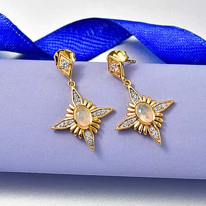 D'Joy Faceted Ethiopian Opal & White Zircon Dangling Push Back Earring in Yellow Gold Plated Sterling Silver 1.00 Ct.