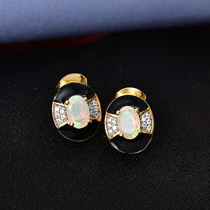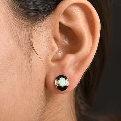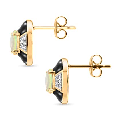D'Joy Faceted Ethiopian Opal & White Zircon Solitaire Stud Push Post Earring in Yellow Gold Plated Sterling Silver.