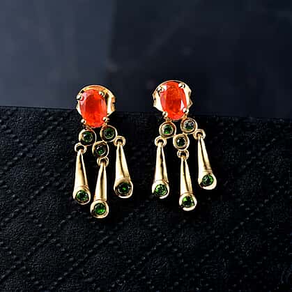 D'joy Fire Opal, Natural Chrome Diopside Dangling Earring with Push Back in Yellow Gold Plated Sterling Silver