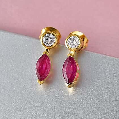 D'Joy Fissure Filled Ruby & Moissanite Solitaire Stud Push Post Earring in Yellow Gold Plated Sterling Silver 1.92 Ct.