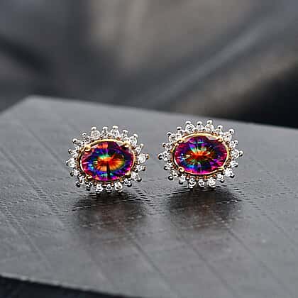D'Joy Nebula Quartz Doublet & White Zircon Halo Push Post Earring in Yellow Gold Plated Sterling Silver 2.44 Ct.