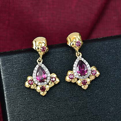 D'joy Orissa Rhodolite Garnet, White Zircon Floral Drop Earring with Push Back in Yellow Gold Plated Sterling Silver 1.79 Ct.