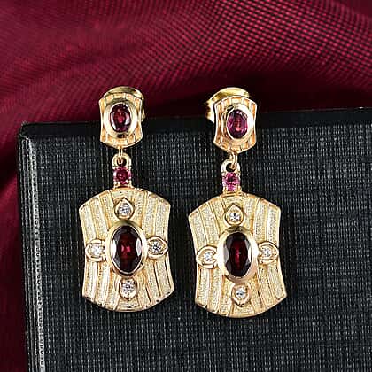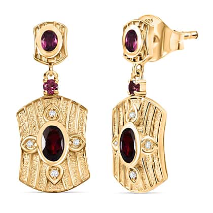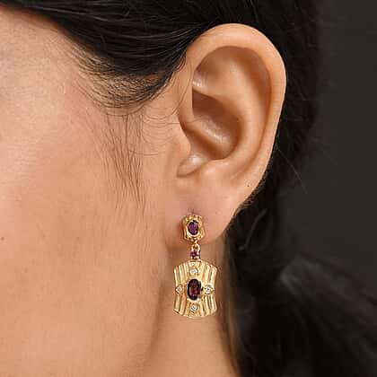 D'joy Orissa Rhodolite Garnet & White Zircon Dangling Earring with Push Back in 18K Yellow Gold Plating Sterling Silver 1.92 Ct, Silver Wt. 5.78 Gms.