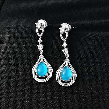 D'Joy Paraiba Moonstone & White Zircon Dangling Earring with Push Back in Platinum Overlay Sterling Silver 2.65 Ct.
