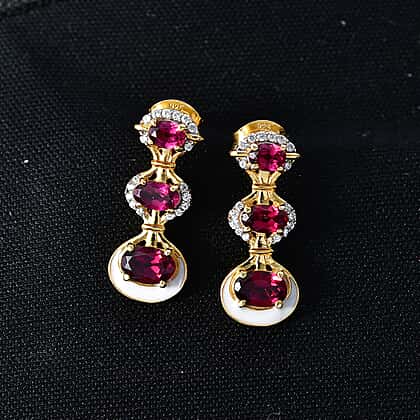 D'Joy Rhodolite Garnet & White Zircon Vertical Drop Push Post Earring in Yellow Gold Plated Sterling Silver 2.42 Ct.