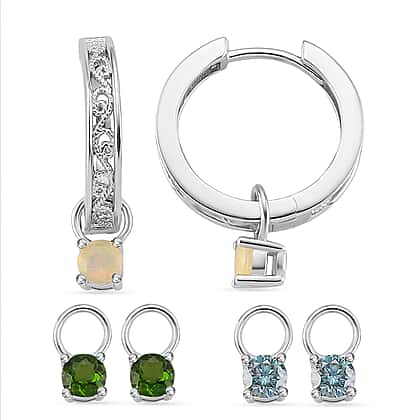 Add a pop of colour and shine with the D'Joy Set of 3 Earrings, featuring natural chrome diopside, Ethiopian opal, and blue moissanite stones. Expertly crafted in rhodium overlay on 925 sterling silver with a hoop design, these earrings are a stunning way to brighten any look. Each pair is designed with a secure fit and comfortable wear, making them the perfect accessory for both special occasions and everyday elegance. The shimmering stones add a vibrant touch to your collection.