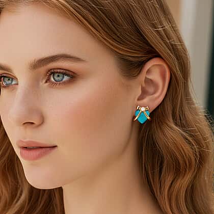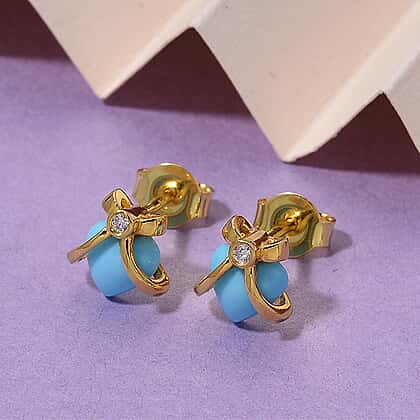 Add a succinct pop of turquoise hue to monochrome and neutral attires with these utterly-pretty, D'Joy Sleeping Beauty Turquoise and Moissanite earrings. These stud earrings feature a graceful bow-like pattern covering the heart-shaped turquoise. It feels like a gift wrapped with love! These earrings gently drop below the ear lobes and look every bit girly and flirtatious. If you are eyeing to nail the coquette-core aesthetic, these are just the earrings you need to get your hands on! Crafted in yellow gold-plated sterling silver, these earrings come with a push-back closure that makes them super-easy to wear and take off.