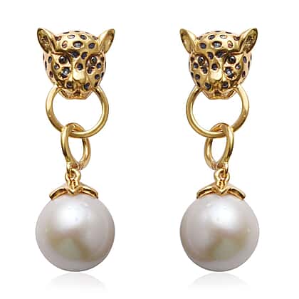Edison Pearl Panther Head Drop Earrings with Push Back in Gold Plated Sterling Silver 10.45 Grams